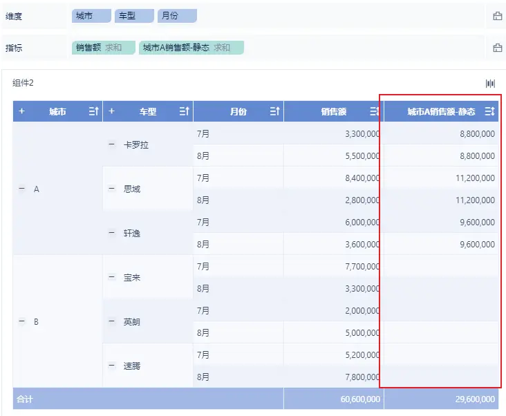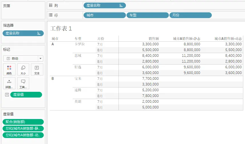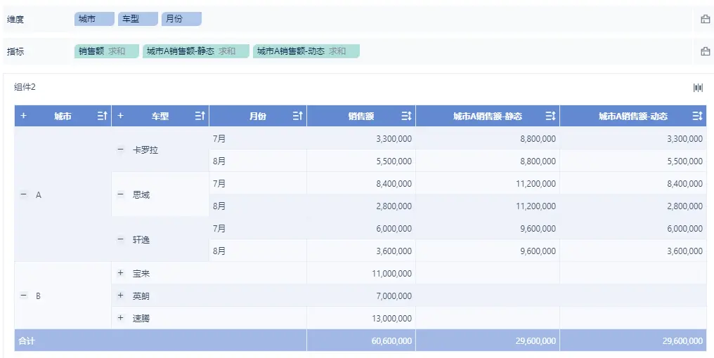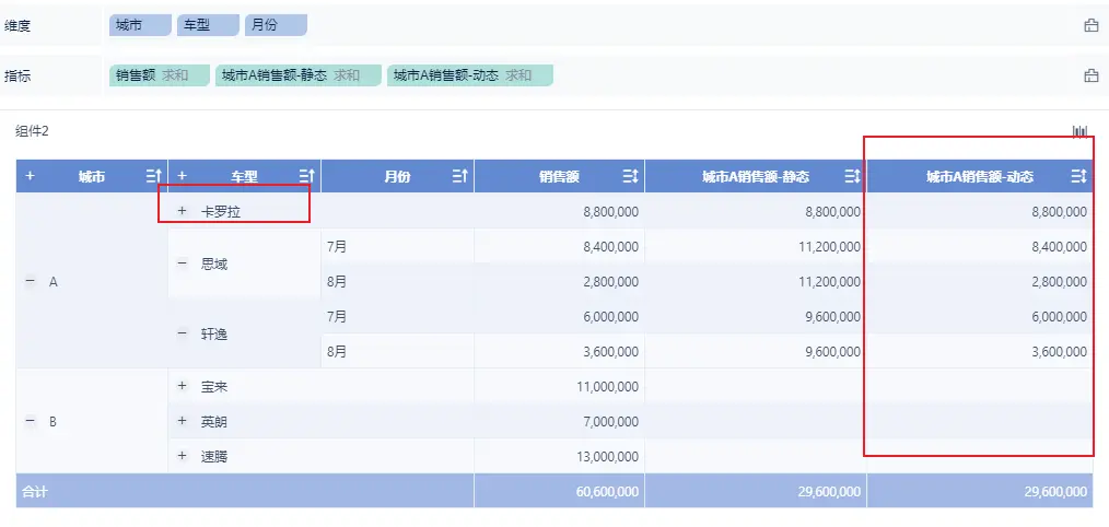案例二:计算A城市的销售额,可动态汇总车型、月份等。