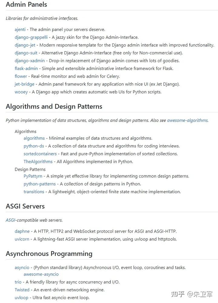 awesome python系列,这是python库的集合项目,总结了几百个各种应用方向的python第三方库。和其他awesome系列一样,awesome python推荐的都是热门项目,对选择困难症的小伙伴来说是福音。