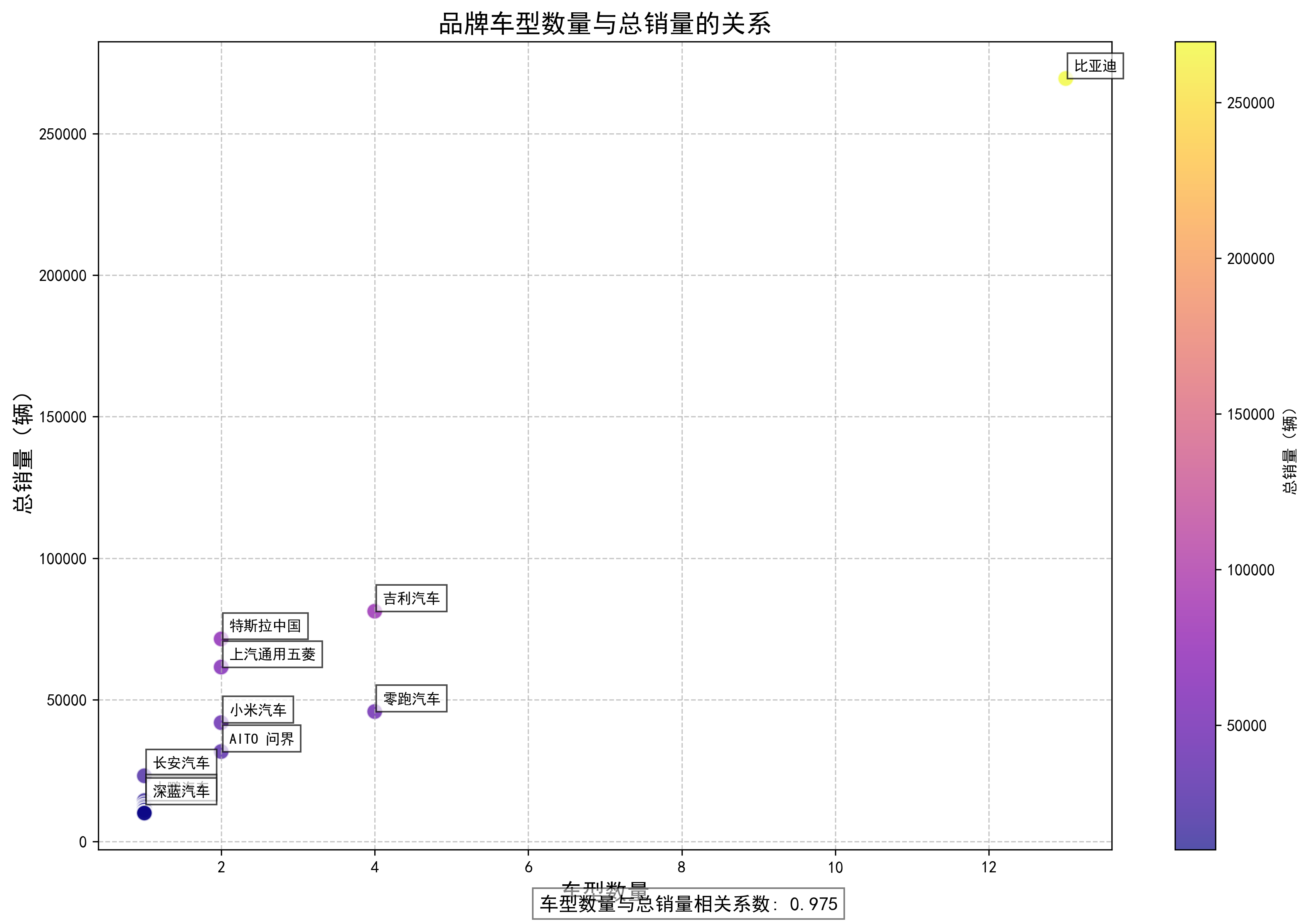 2、分析不同品牌车型数量与总销量之间的关系,是否车型越多销量越高?