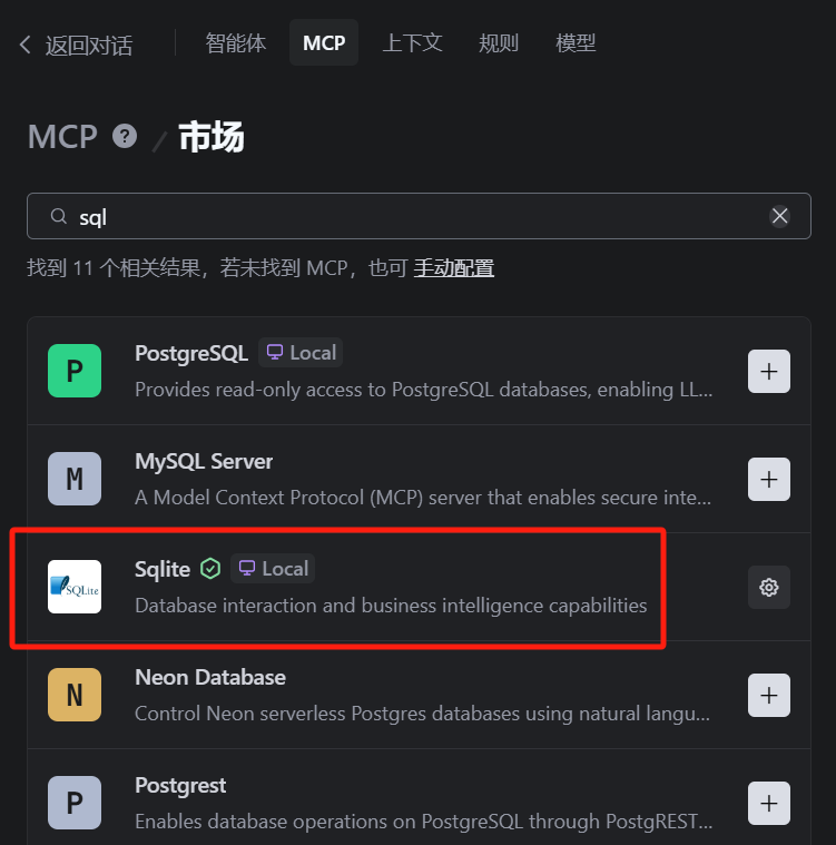 SQLite MCP就是现成的,能直接从集市里添加,然后在配置信息里输入前面的my_db.db数据库路径地址,保存即可。