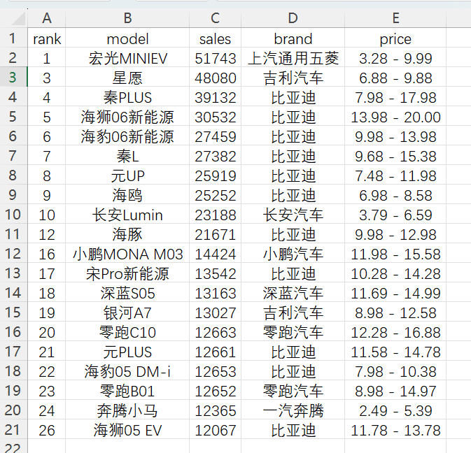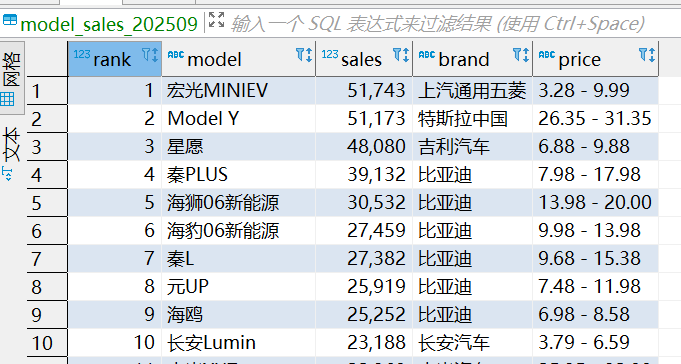 接下来咱们列举几个常见的数据库处理场景,以某月份车型销量数据为例,该数据已经提前存储在SQLite数据库中。