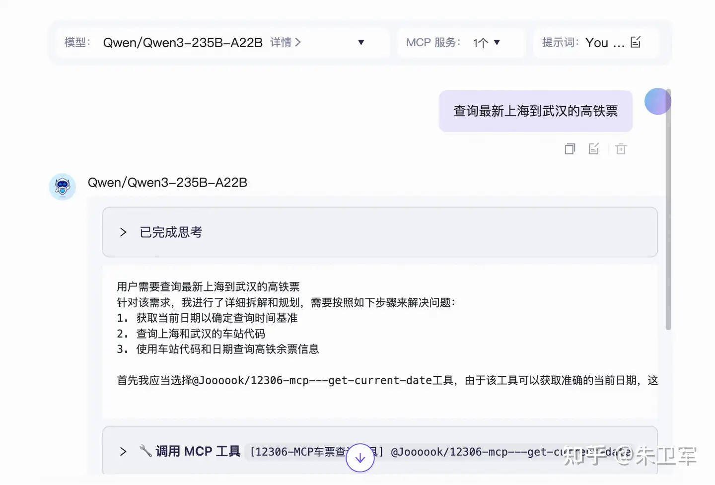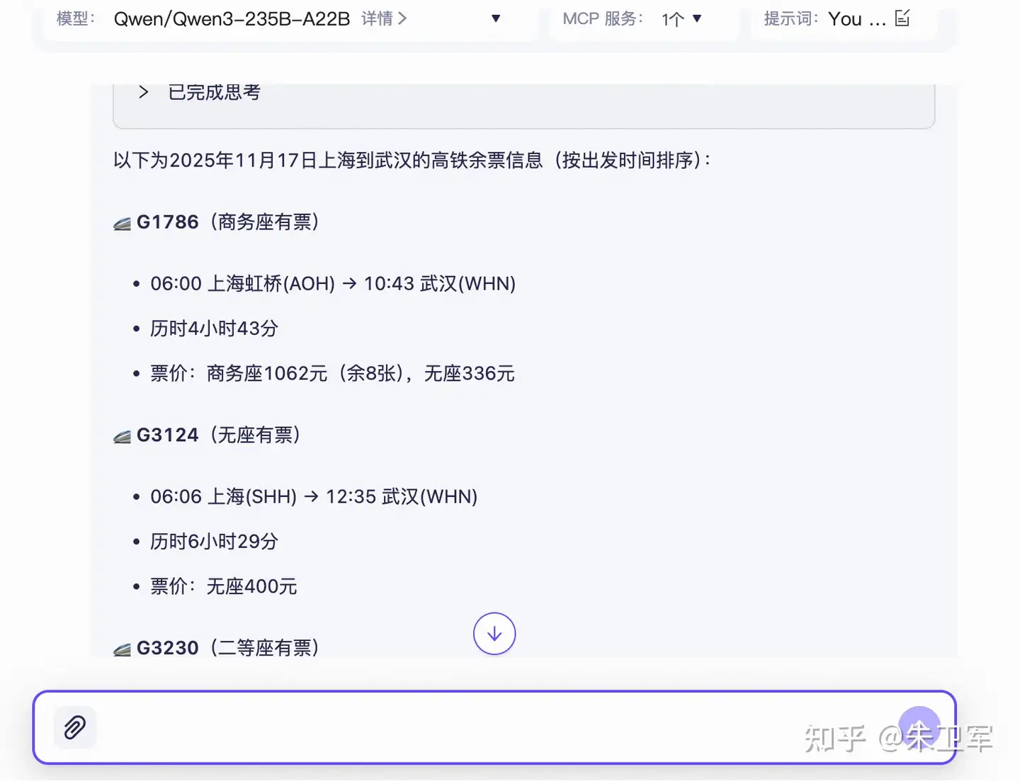 最终大模型会调用MCP查询到相关火车票。