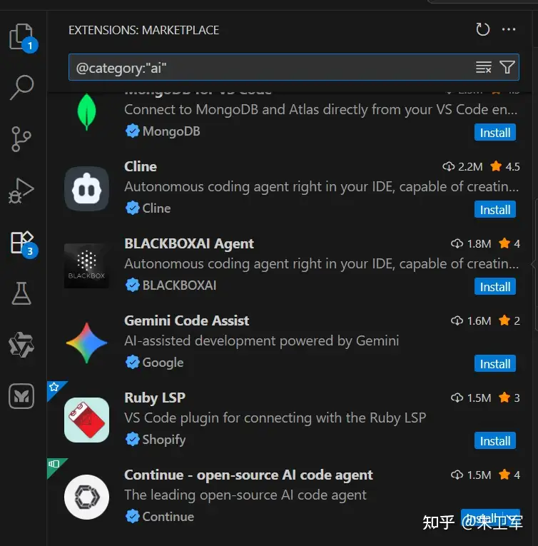 还有现在大热的AI编程类插件像copilot、cline、gemini code assist、continue、openai codex等,安装非常简单,直接能在代码框中使用,不需要额外安装软件。