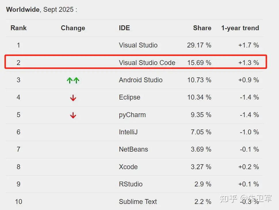 在最新9月的IDE市占率排名中,vscode仅次于自家兄弟visual studio,排名第二,但visual studio市占第一主要因为与windows深度绑定影响的,从自然用户来看,vscode应该排第一。