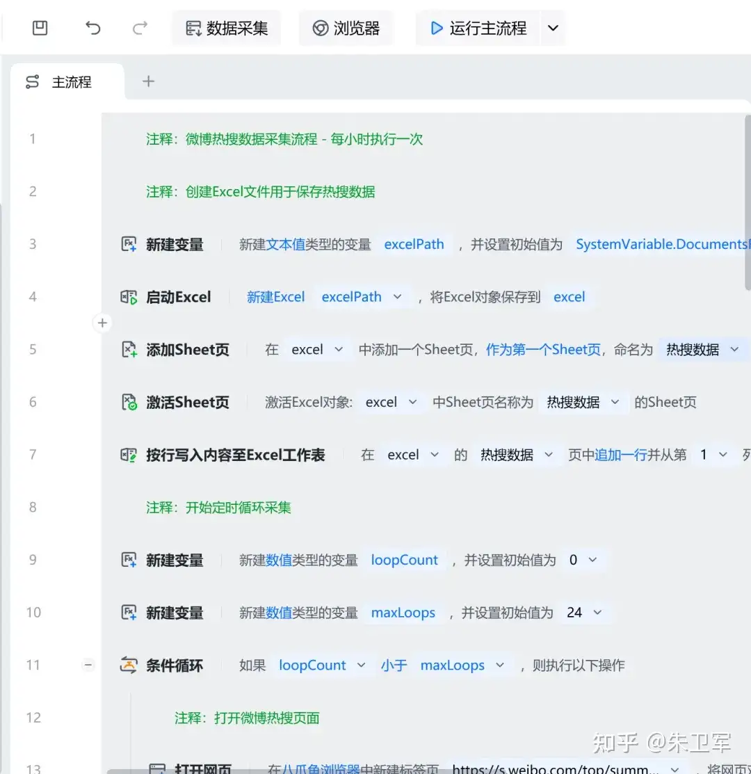 然后它就自动在流程设计界面写好流程,包括打开微博热搜页面、采集热搜标题和链接、创建excel文件、存入数据、保存excel文件、设置定时等流程。