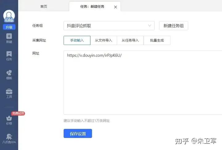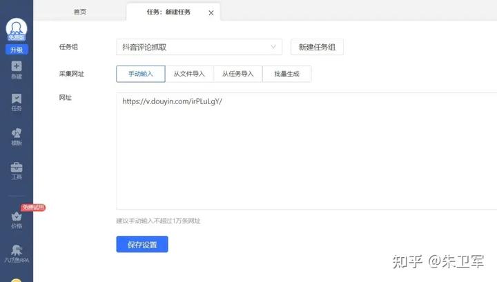 首先是要创建一个爬取任务,包括任务名称(抖音评论抓取),网址url(你想要抓的视频链接)