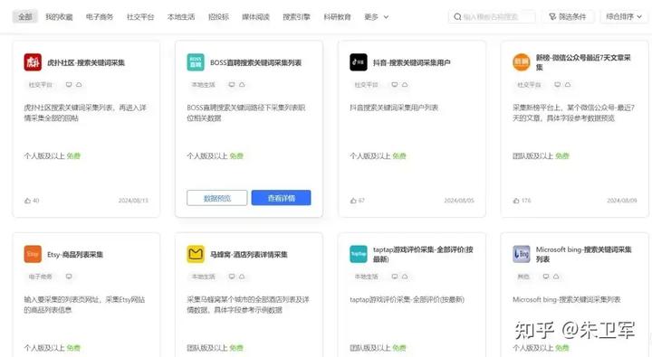 不管是文本、图片、视频亦或表格,八爪鱼都能抓,而且它还提供了非常丰富的采集模板,比如电商、新闻、短视频等主流平台全包含,它已经帮你配置好了流程,一键可以实现爬虫。