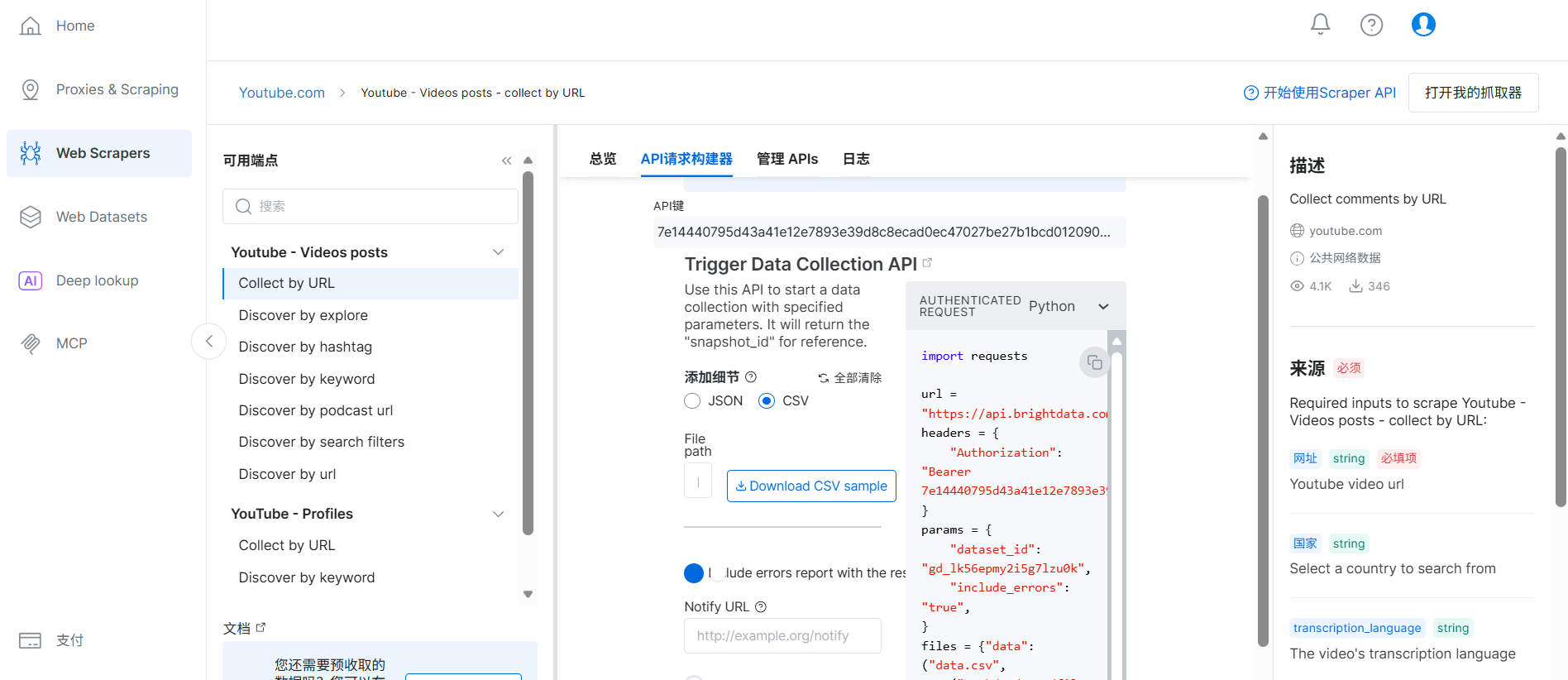 先选择“Youtube - Videos posts - collect by URL”,测试下使用Python requests调用API来采集视频信息。