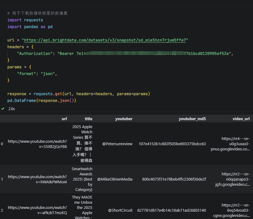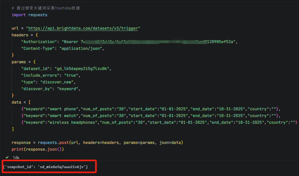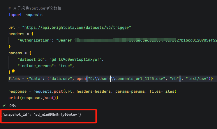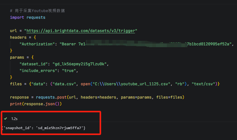 数据采集任务开始后,代码会返回一个snapshot_id,代表采集的数据会保存在亮数据的数据库里,通过特定的snapshot_id可以调用,这一般需要等待几秒钟。