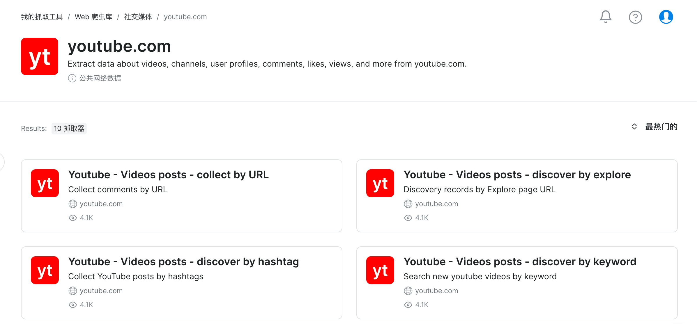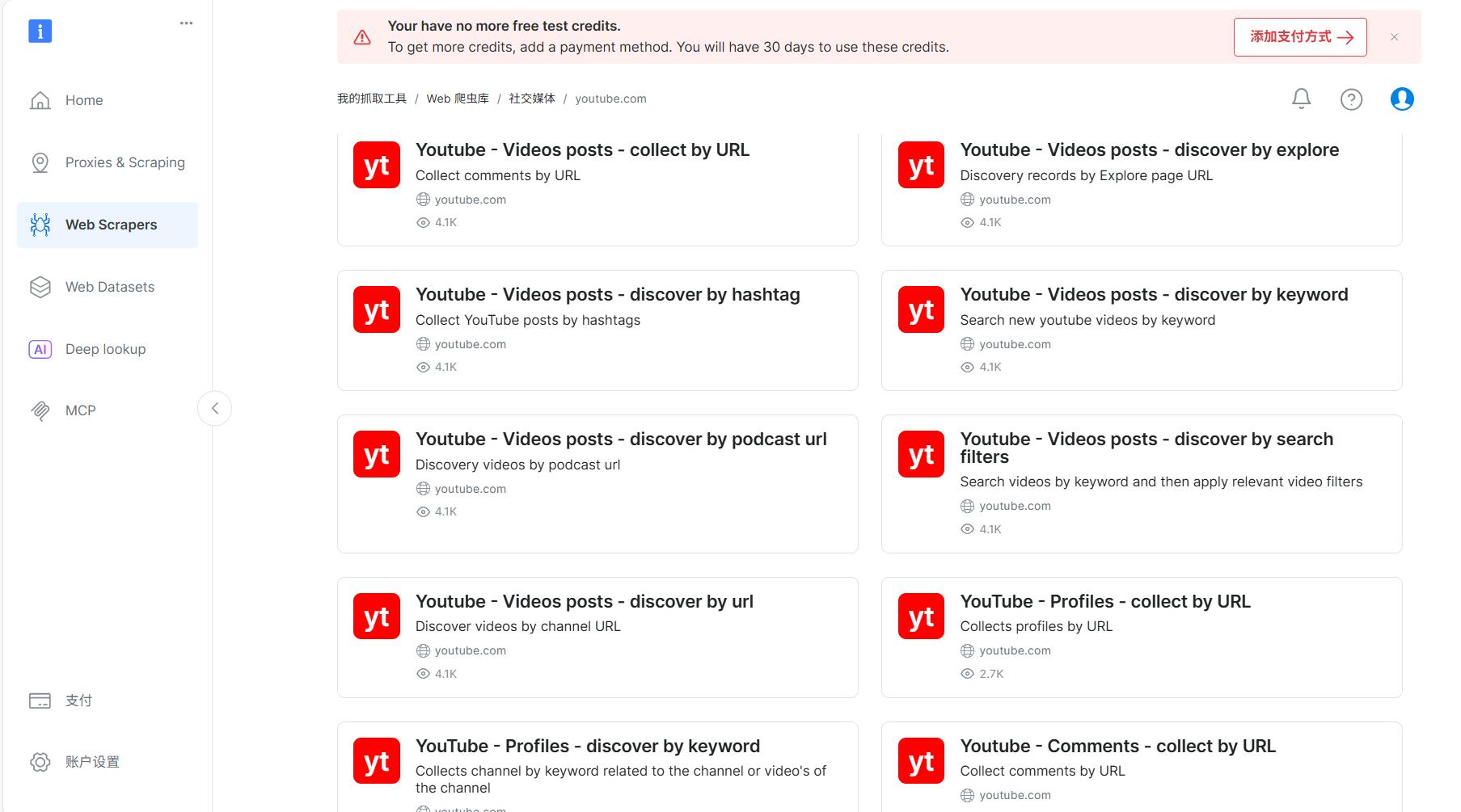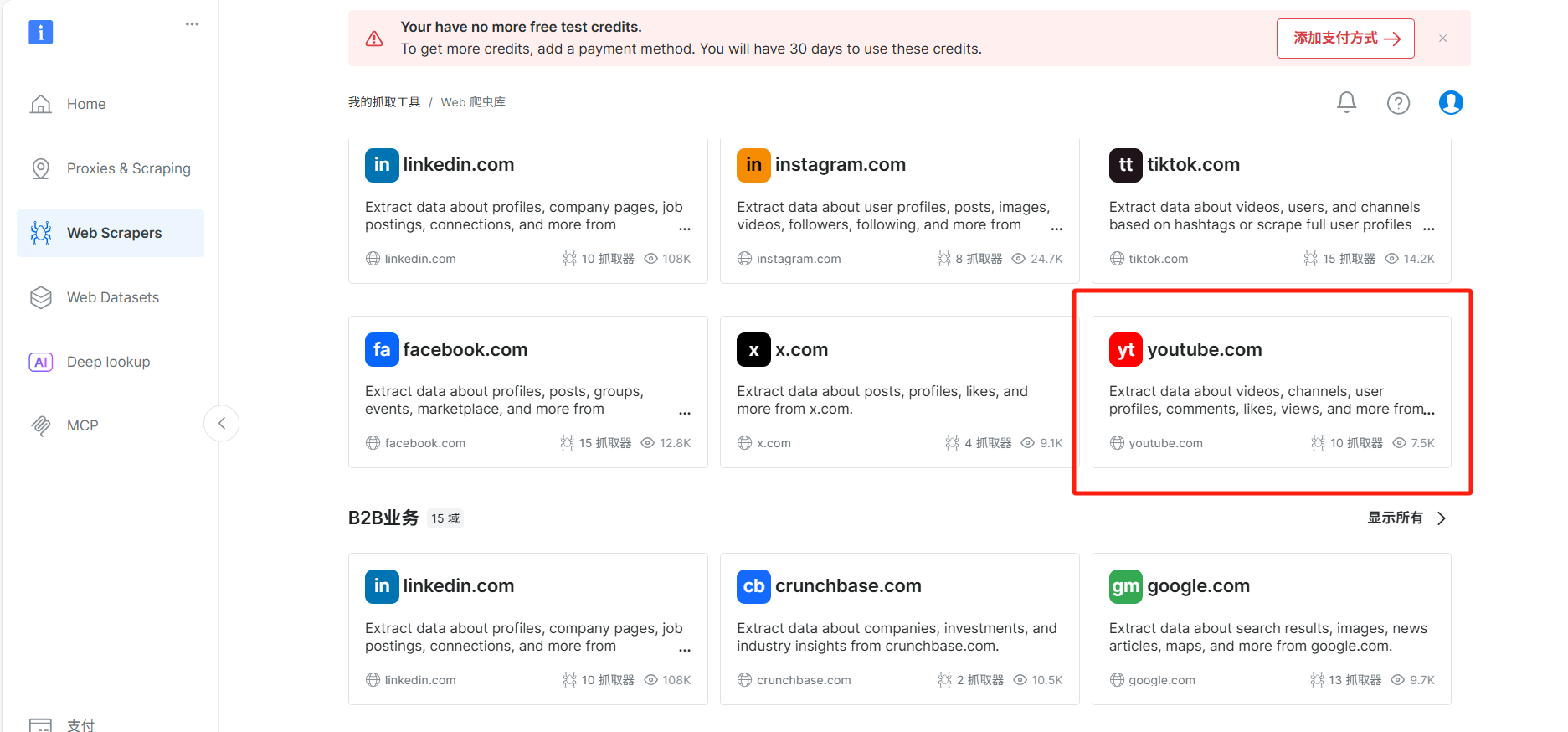 然后进入Web Scrapers菜单,这是用来配置网页采集API的功能区,油管采集模板就在这里。