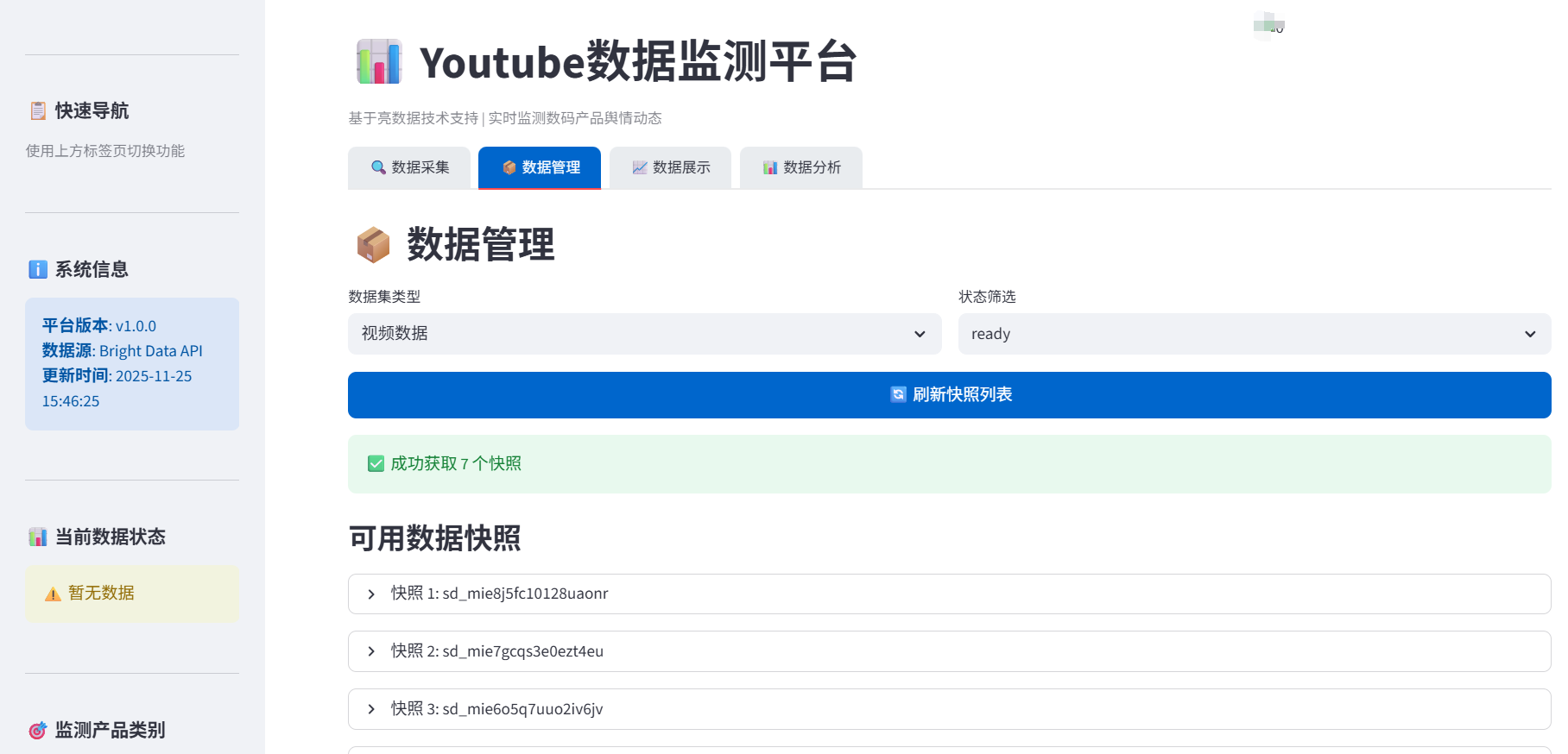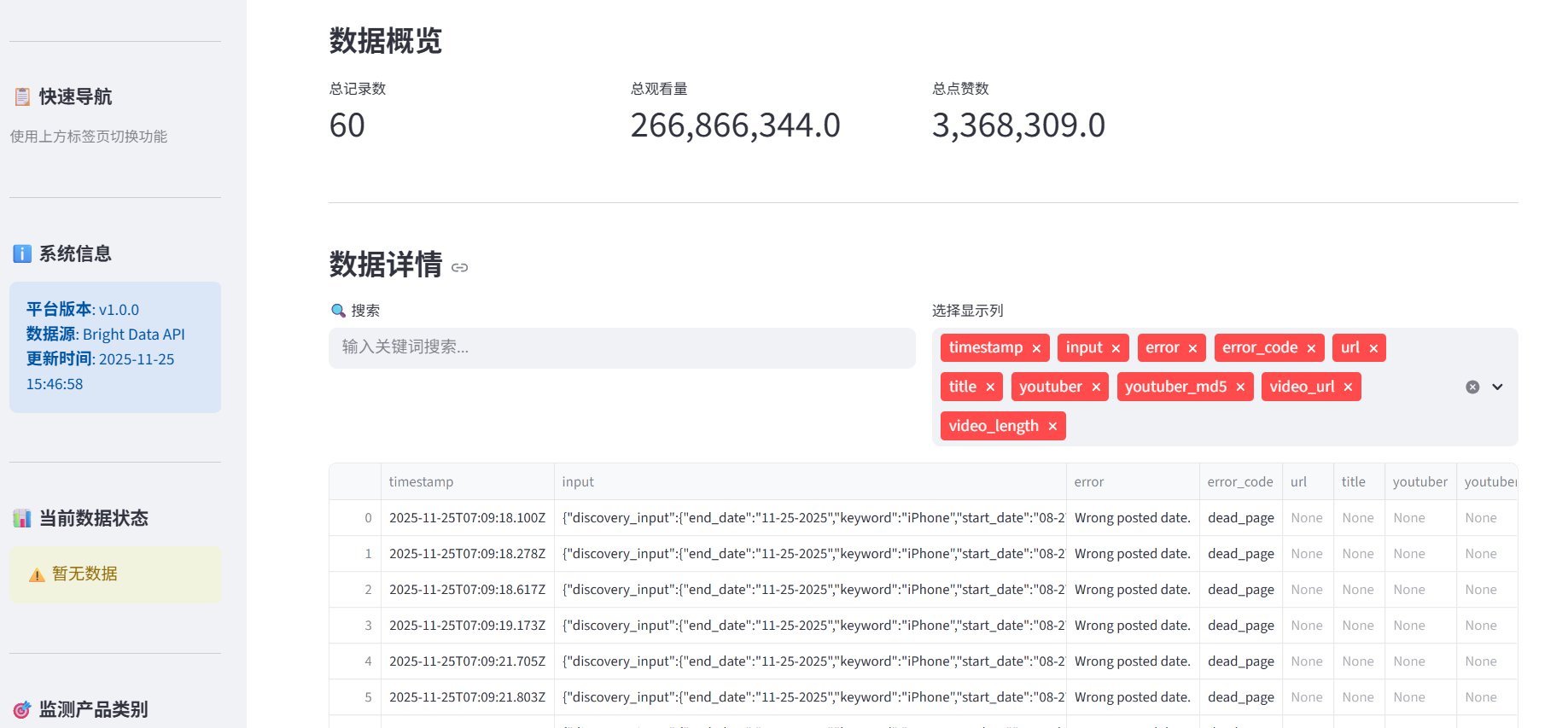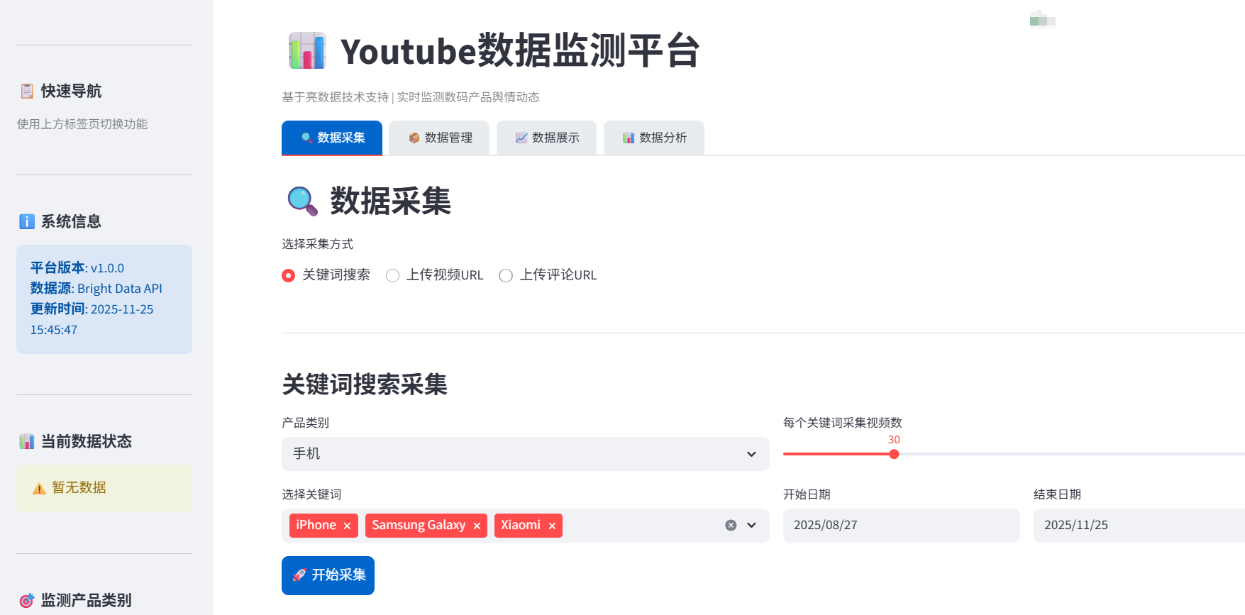 如果觉得写代码比较麻烦,你可以尝试将以上的采集API封装到web应用里,通过可视化的界面来采集、分析Youtube数据。