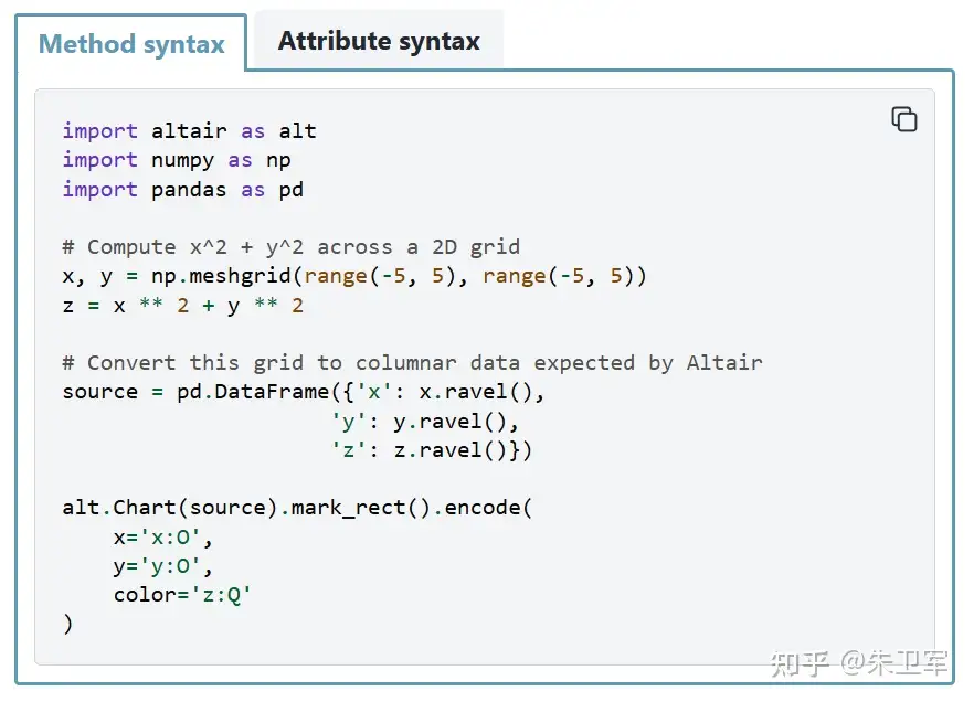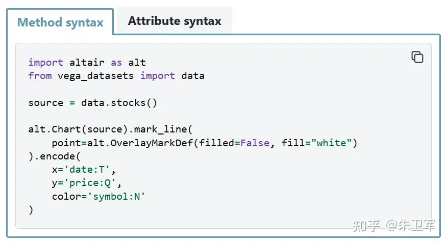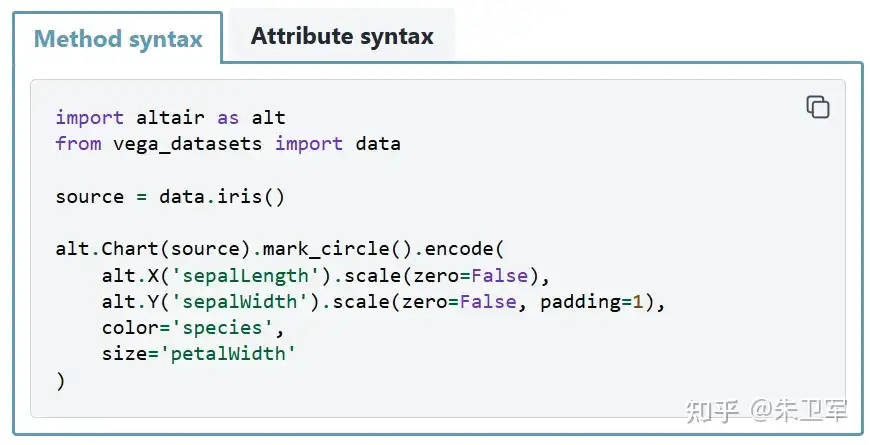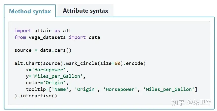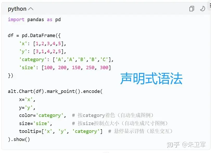 Altair不同于Matplotlib,它绘制图表代码更加简单直接,因为Altair是“申明式”语法,你只要提做什么就可以,Altair会自动渲染细节,不需要像matplotlib那样,要指定每个元素的步骤细节。