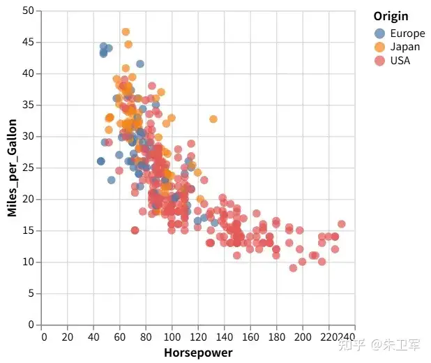 比如说Altair绘制散点图,只需要在一个函数里告诉它x、y字段用什么数据,图表标题、大小是什么就可以,而Matplotlib则需要手工去创建画布、标题、尺寸,每个元素都需要去设计,更加麻烦。