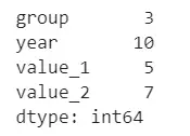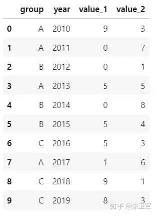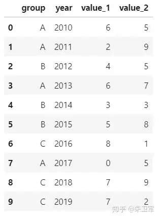 df = pd.DataFrame({'group':groups, 'year':years, 'value_1':values_1, 'value_2':values_2})