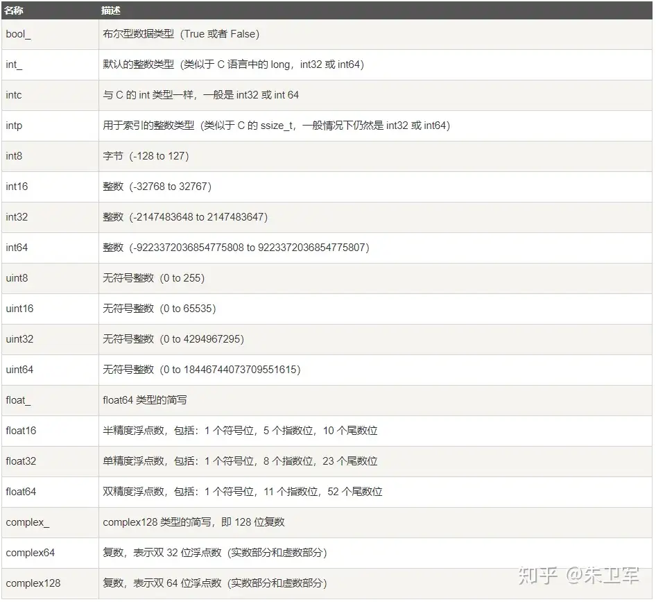 Numpy支持的数据类型非常多,所以很适合做数值计算。 下面给出常见的数据类型:
