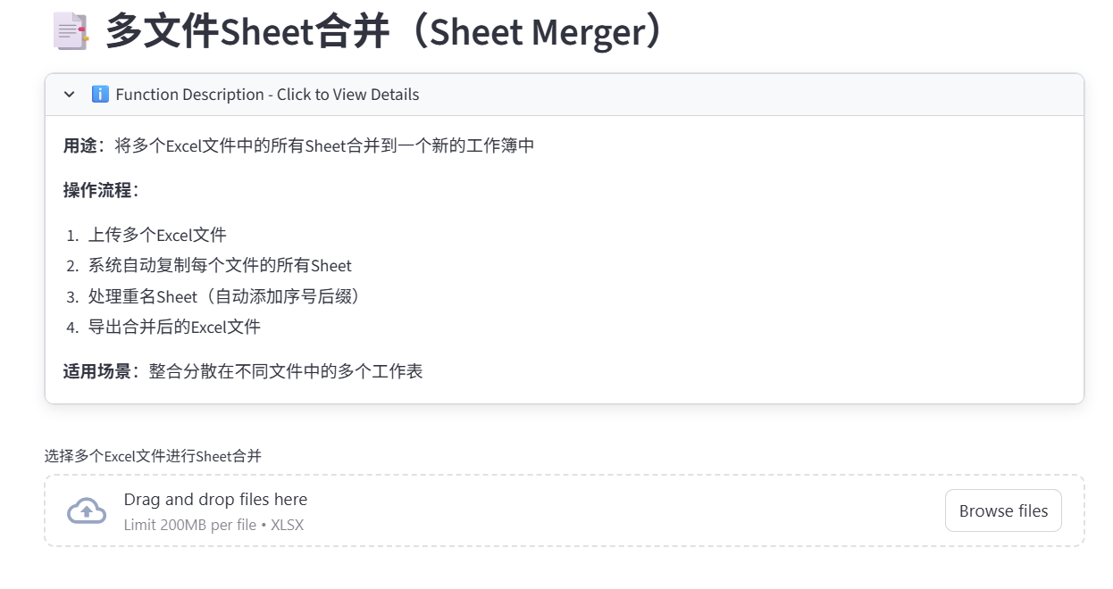 多文件的Sheet合并,导入多个Excel后,它会把所有Excel的所有Sheet合并到一张Excel中。