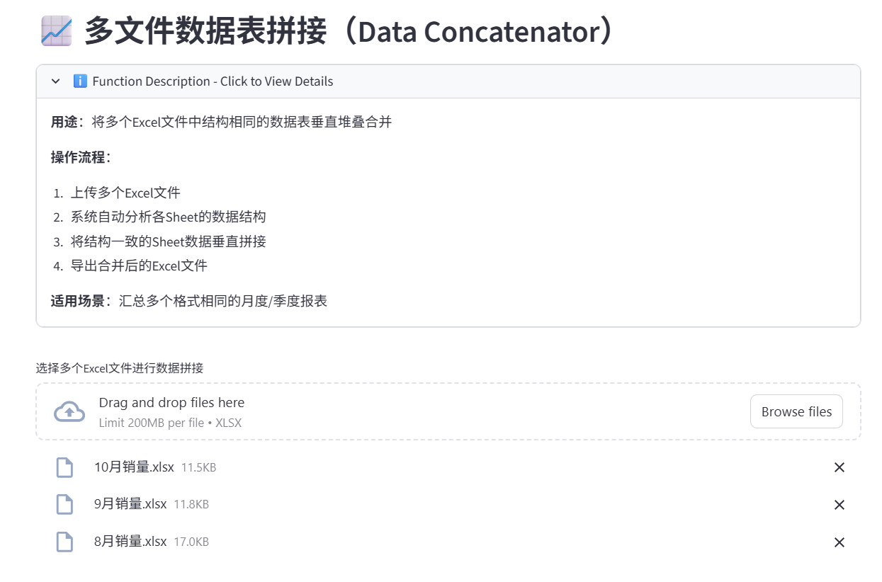 这个应用是基于Python Streamlit进行搭建的,交互比较友好,处理速度也比较快,比如说100张Excel表进行拼接,可能也就一分钟就能处理好。