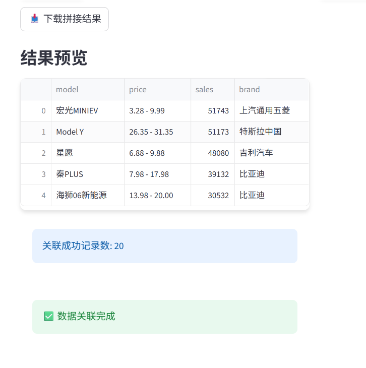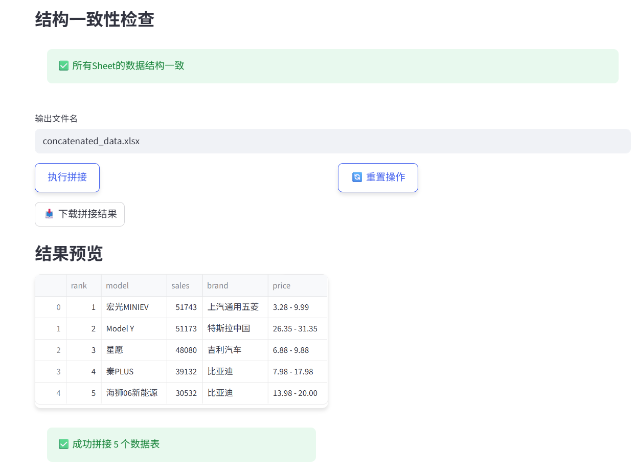 该应用会进行结构一致检查,没问题就会执行拼接,并给到结果预览,然后支持下载拼接结果,得到一张拼接好的Excel表。