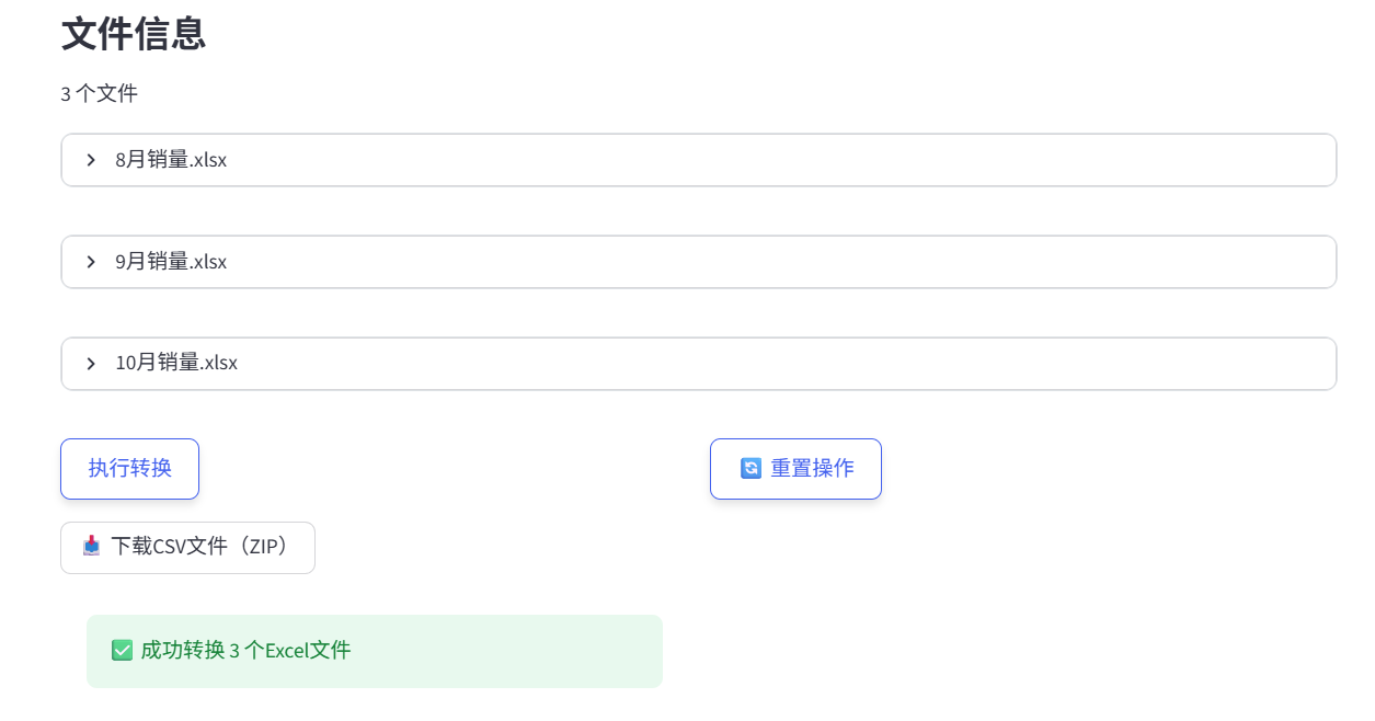 多个Excel文件批量转为CSV格式,导入多个Excel文件,批量转化后,就会得到内容相同的CSV文件,不同的sheet会单独导出一个CSV文件。