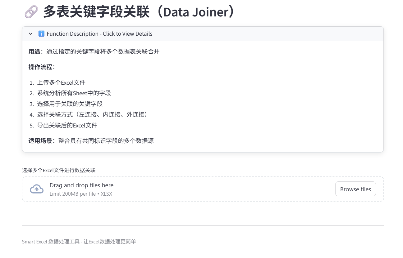 对于常用的vlookup关联操作,也可以用该应用实现,直接导入需要进行关联的多个Excel表格。