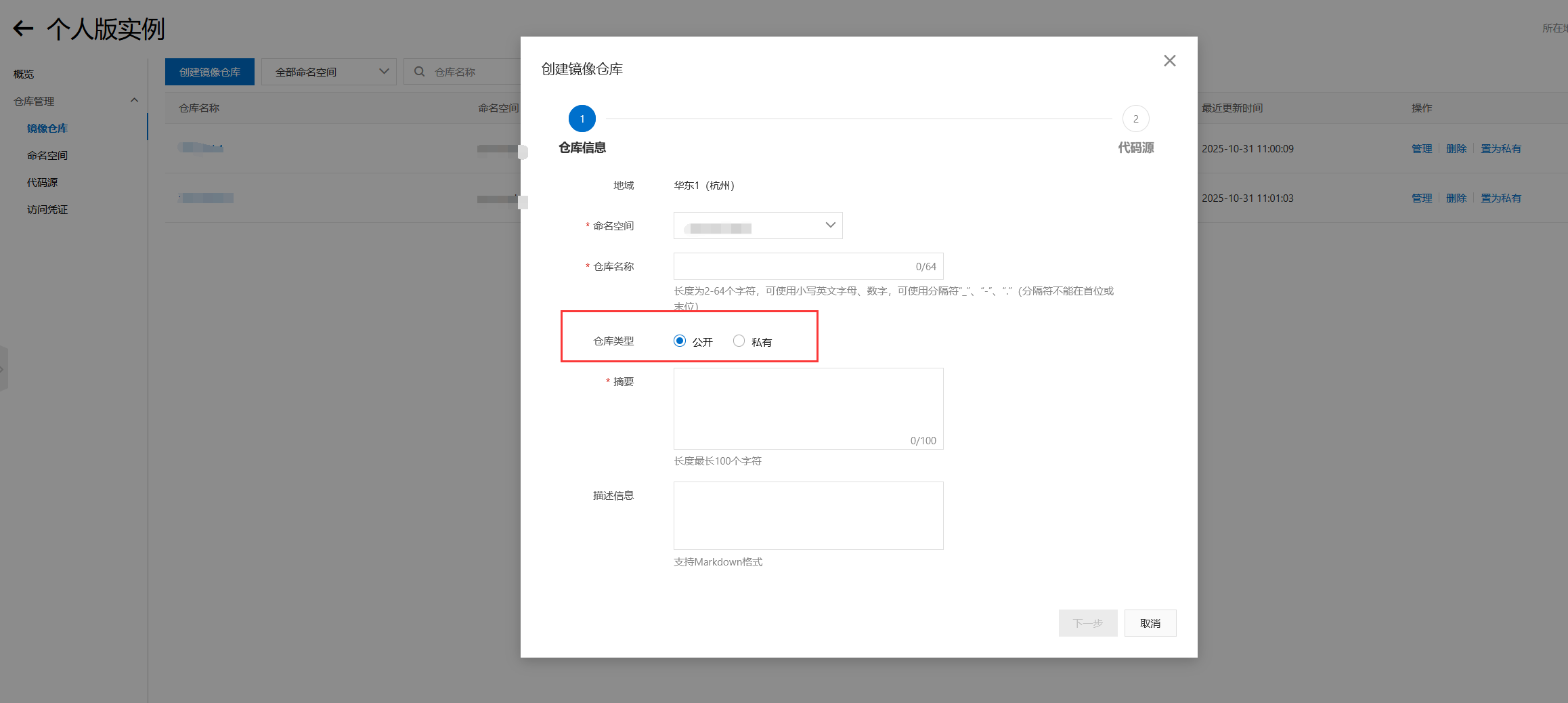 具体使用也很简单,我们创建一个个人实例,选择本地仓库(划重点),然后创建镜像仓库,仓库类型设为公开(划重点!!否则容器无法创建)