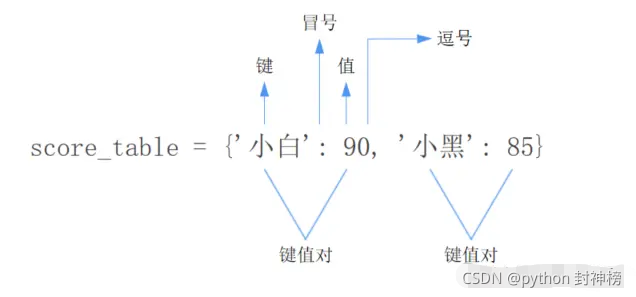 我们用一个花括号{}把这些"成对的"数据括起来,如: {'小白': 90, '小黑': 85},就可以定义一个字典。