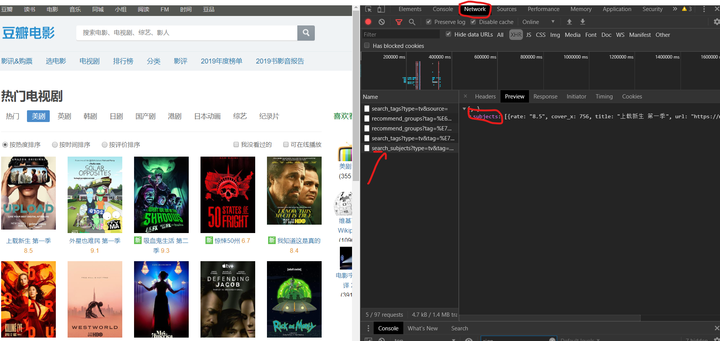 (2)点开subjects,可以看到 title 就是对应电影名称。rate就是对应评分。通过js解析subjects字典,找到需要的字段。
