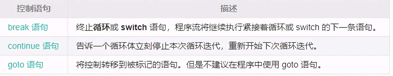 另外还要注意的是这三种循环都可以用break语句跳出循环,用continue语句结束本次循环,而goto语句与if构成的循环,是不能用break和 continue语句进行控制的。