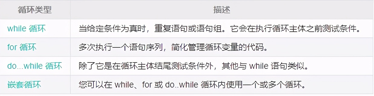 C 语言提供了以下几种循环类型:C语言中提供四种循环,即goto循环、while循环、do –while循环和for循环。
