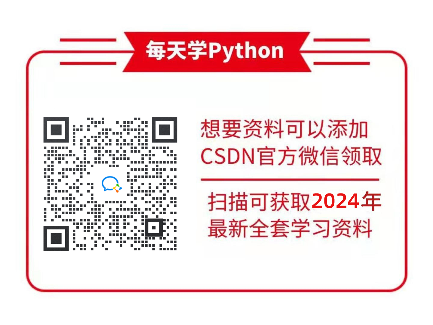 这份完整版的Python全套学习资料已经上传优快云,朋友们如果需要可以扫描下方优快云官方认证二维码或者点击链接免费领取 【保证100%免费】 读者福利 | Python经典学习资料免费分享,领走不谢!