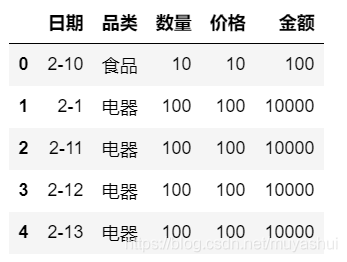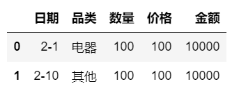 data1 = pd.DataFrame(lis1,columns=['日期','品类','数量','价格','金额'])
