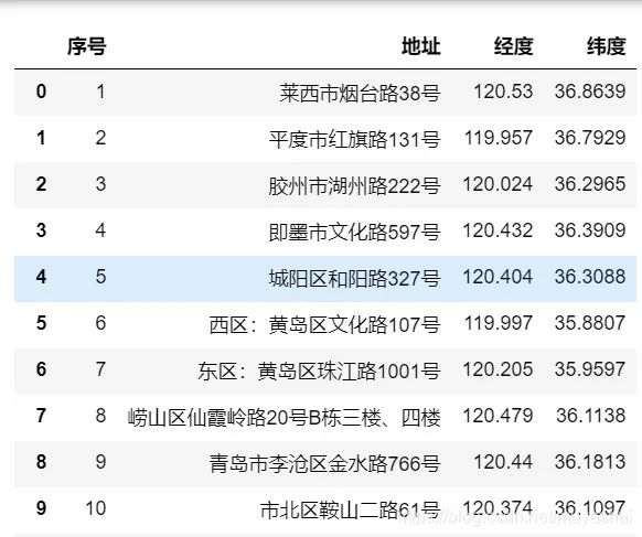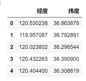 data.iloc[i,2] = getlnglat(data.iloc[i,1])[0] # 经度 将第i行,第2列的地址(列索引为1)转换为经纬度,并将经度赋值给第i行,第3列(列索引为2)