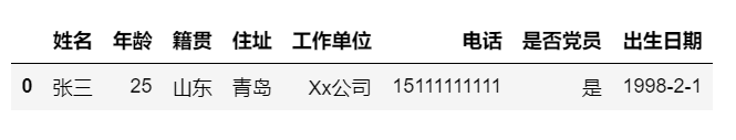 datai.columns = ['姓名','年龄','籍贯','住址','工作单位','电话','是否党员','出生日期']