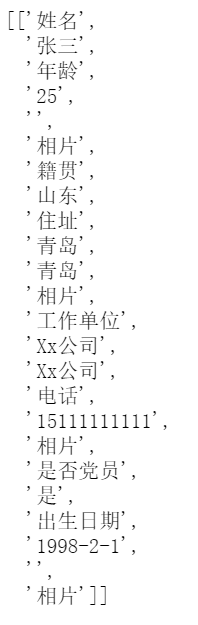 cells = biaoges[1]._cells``cells_lis = [[cell.text for cell in cells]]