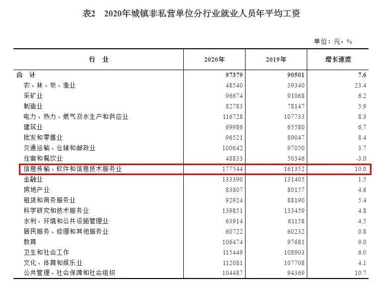 2020年平均工资出炉:IT业年平均工资超17万元,连续5年雄踞第一。
