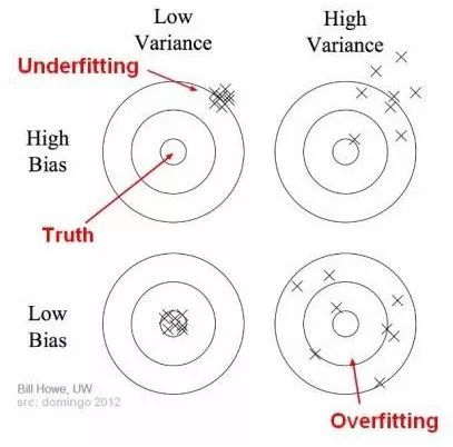 上图中,圆圈中心是能够完美预测精准值的模型。事实上,你永远无法找到这样好的模型。随着我们离圆圈中心越来越远,模型的预测也越来越差。
