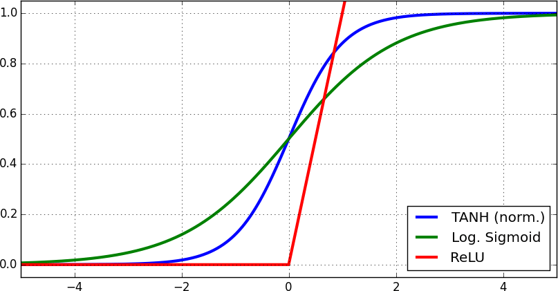 这些函数是连续函数,也就是说如果输入有较小的可微分的变化(在其定义域中的每个点上都有导数),那么输出也会有较小的变化。当然,如前面提到的那样,导数的计算是非常重要的,而且决定了我们的神经元是否可以训练。值得提及的几种激活函数有 Sigmoid、Softmax 和 ReLU。