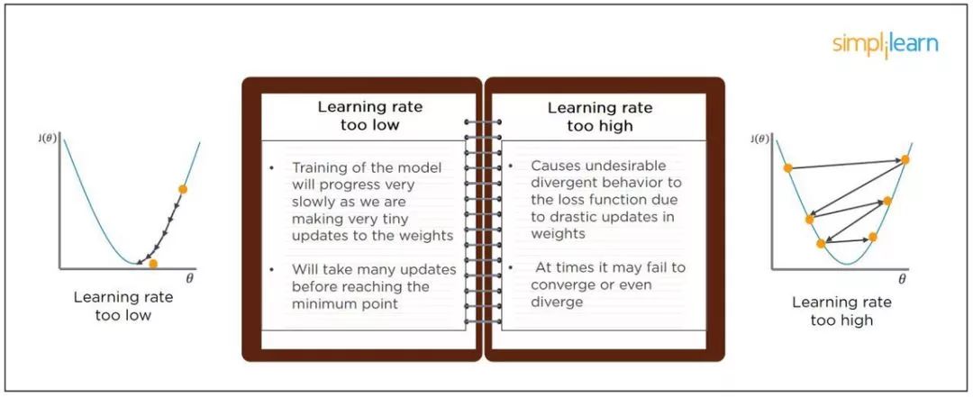 当模型的学习率过低时,模型的训练速度会变得非常慢,因为其每次对权重的更新会变得非常小。模型将需要大量更新才能到达局部最优点。