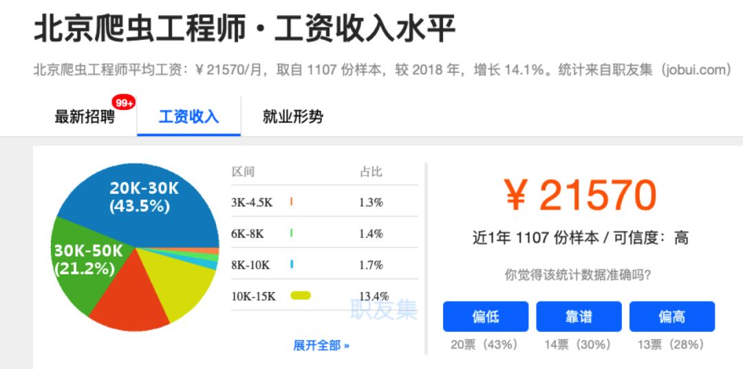 先看看Python的平均工资,仅仅是爬虫工程师的薪资,平均月薪达21k。这份数据来自于职友集2020年1月13日的结果: