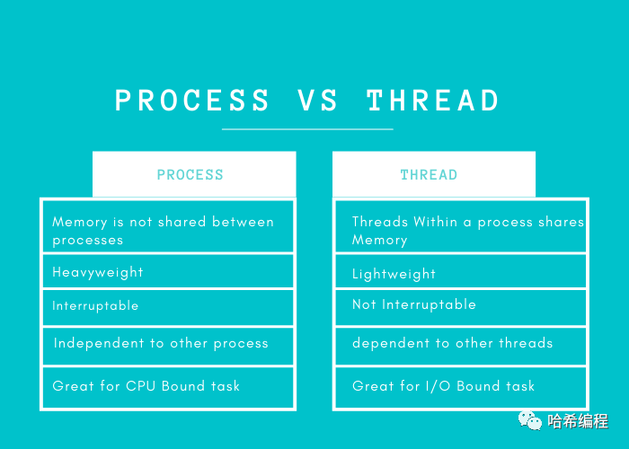 线程化是多个线程同时运行以执行不同任务的技术,而多处理是多个进程同时运行在不同CPU上的技术。下图对进程和线程的区别进行了说明,更多的信息请参考:这儿