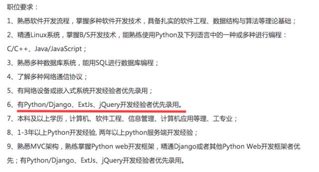 2)如果你想学习Python语言找一份开发的工作,那看企业的岗位中有哪些要求。