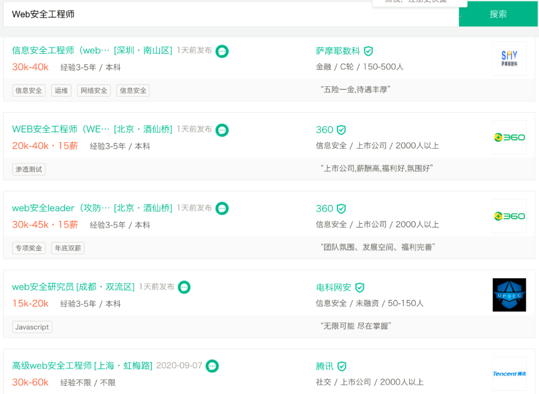 而且,我们到招聘网站上,搜索【网络安全】【Web安全工程师】【渗透测试】等职位名称,可以看到安全岗位薪酬待遇好,随着工龄和薪酬增长,呈现「越老越吃香」的情况。