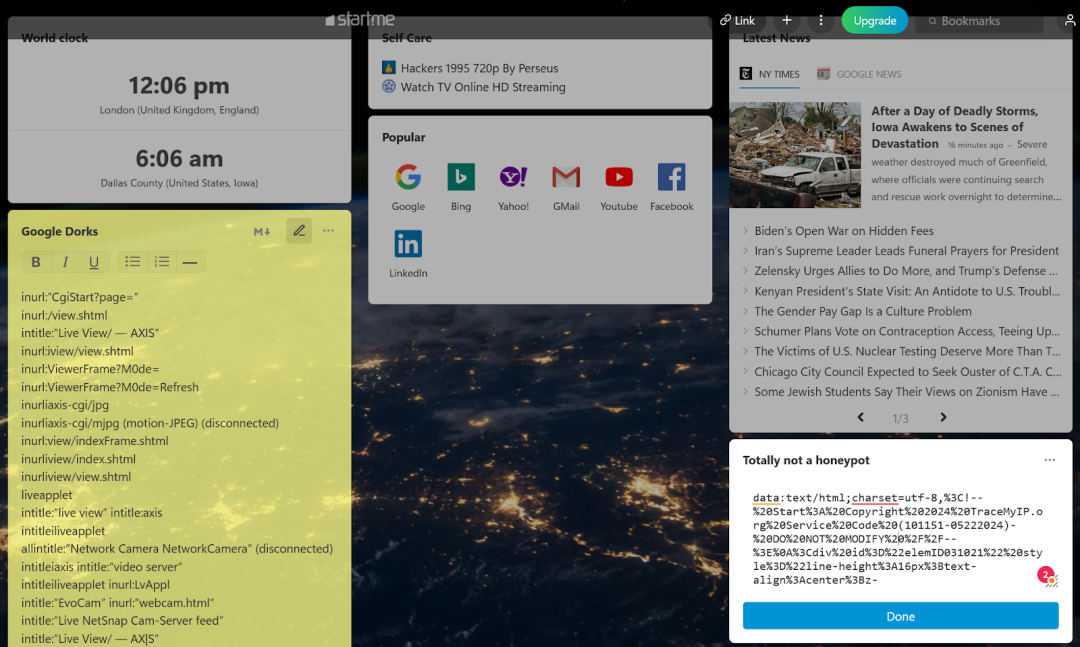 请记住,你可以使用任何允许用户运行第三方代码的平台来托管你的 IP 日志脚本。例如,Start.me 允许第三方嵌入代码,用户可以在这里整理自己喜欢的网站链接、新闻源、笔记等。