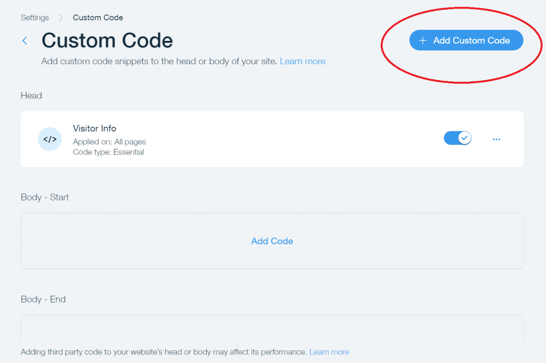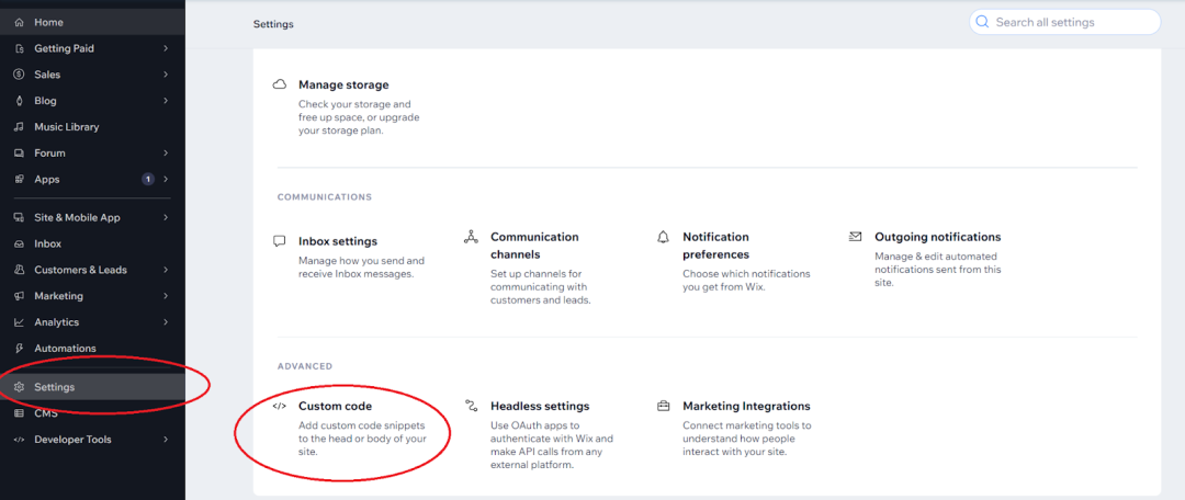 在此阶段,你不需要建立 Wix 网站,这可以稍后再做。前往“设置”,点击“自定义代码”。