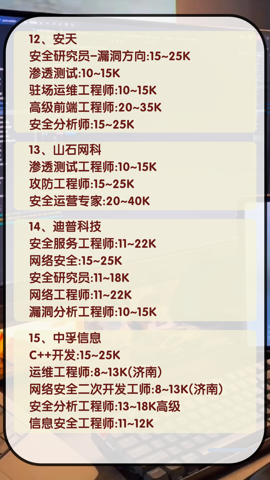 网络安全TOP15企业的岗位薪资