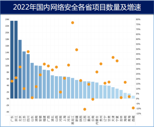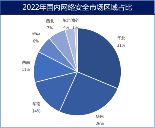 从全局看,经济发达地区,如华北、华东和华南地区,对网络安全的投入加大,因此2022年区域市场占比有所提升。从省份看,大部分省份网络安全市场整体项目量保持正增长。受宏观经济形势影响,各省份增速分化较为明显,呈现不均衡发展态势。网络安全企业紧跟国家“一带一路”战略,积极探索海外市场。深信服、奇安信和绿盟等头部企业海外业务发展良好,创新型企业积极尝试突破,取得一定成绩,海外市场占比小幅提升。预计未来海外市场将成为中国网络安全企业新的业务增长点。