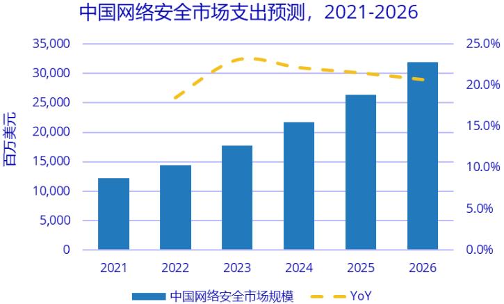 根据IDC2023年《全球网络安全支出指南》,2022年中国网络安全支出规模137.6亿美元(约977亿元人民币),到2026年预计接近288.6亿美元(约2,049亿元人民币),五年复合增长率将达到18.8%,增速位列全球第一。