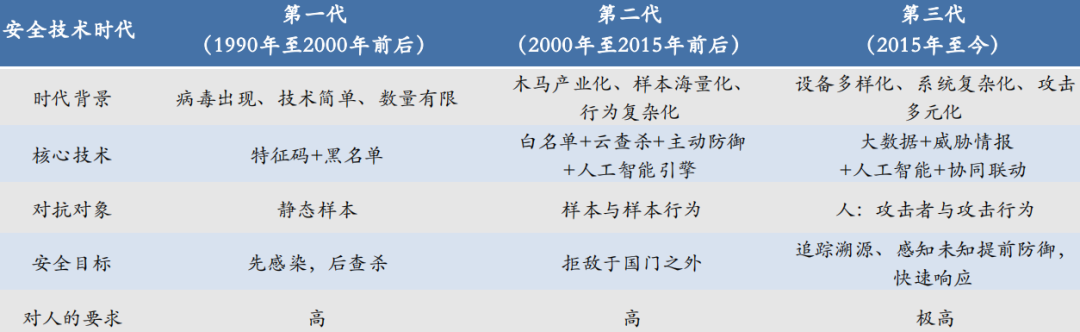 第一阶段:1990年到2000年前后,中国处于以反病毒为代表的主机层面单点威胁被动应对式防护阶段。该时期网络安全特征为单点和被动防御,需求以病毒预防和查杀为主。具体来看,采用黑名单机制,也即“非黑即白”,先是人工分析病毒的特征码,之后在电脑里通过扫描文件进行匹配、查杀。这一时期诞生的主要安全产品为传统防火墙(FW)、入侵检测/防御(IDS/IPS)等。