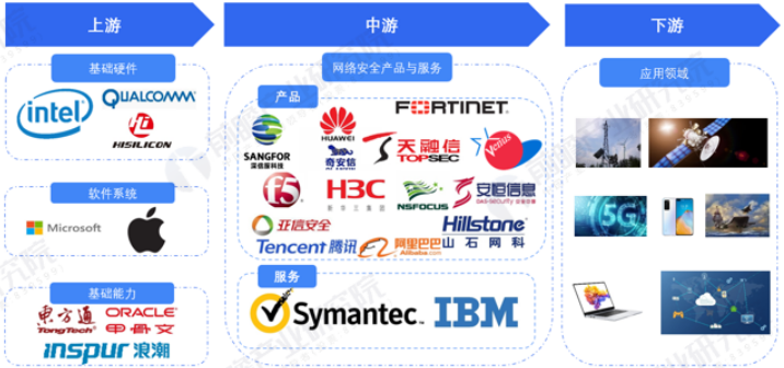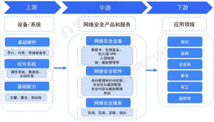 随着国家对互联网安全、个人隐私安全等相关方面的政策出台,网络安全相关产业也随之强大起来,在保障国家、社会和个人的信息安全发挥重大作用的同时,亦推动了相关产业链的发展。从网络安全产业链看,上游为设备/系统等供应商,如芯片、内存、操作系统、引擎等;中游则为网络安全不同细分领域的网络安全产品和服务厂商,如网络安全设备领域的防火墙/VPN,软件领域的安全性与漏洞管理以及服务领域的运维培训等;下游为应用领域,除个人消费者外,还包含政府、军工、金融等相关领域。