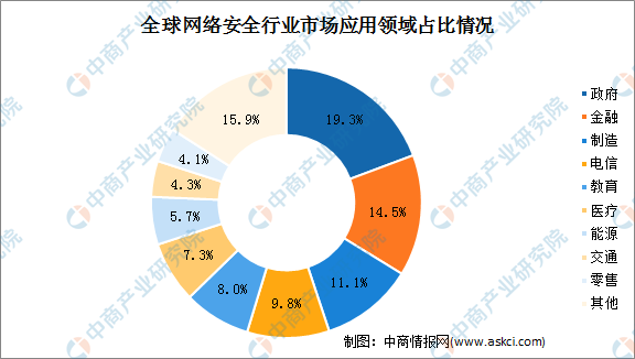 在市场需求方面,信息安全产品行业需求突出,政府、电信、银行、能源、军队等是信息安全企业关注的重点行业,证券、交通、教育、制造等新兴市场需求强劲,为信息安全产品市场注入了新的活力。数据显示,政府(19.3%)、金融行业(14.5%)和制造行业(11.1%)是网络安全最大的三个应用领域。